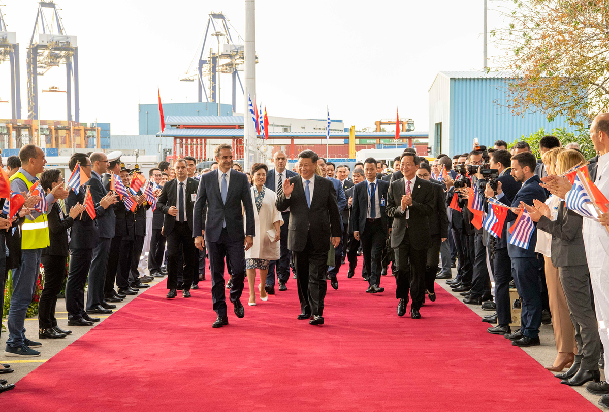 Chinese President Xi Jinping and Greek Prime Minister Kyriakos Mitsotakis visit the Piraeus Port in Athens on Monday. [Photo/Xinhua]