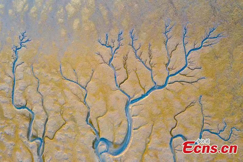 A view of vessel-like patterns left by tides on a mudflat in Tiaozini scenic area in Yancheng City, East China’s Jiangsu Province. (Photo: China News Service/Sun Jinhua)