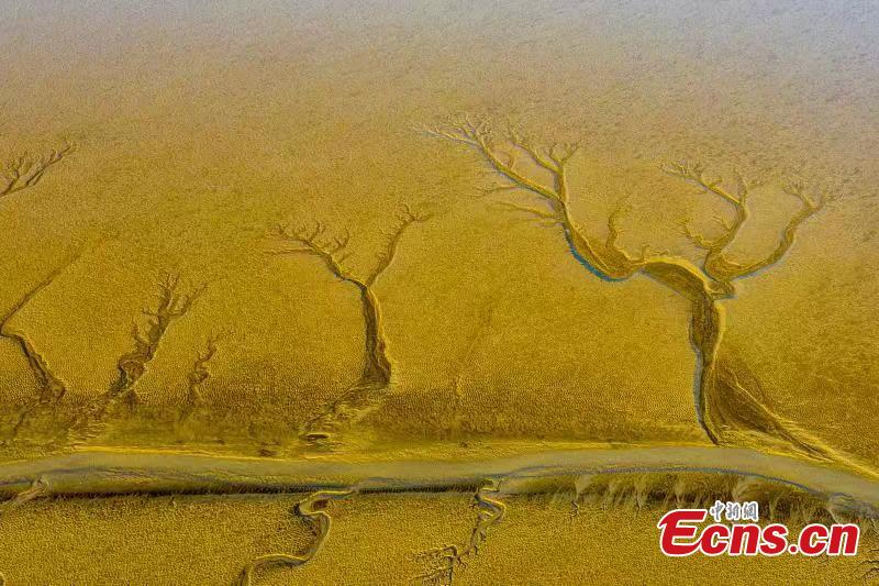 A view of vessel-like patterns left by tides on a mudflat in Tiaozini scenic area in Yancheng City, East China’s Jiangsu Province. (Photo: China News Service/Sun Jinhua)
