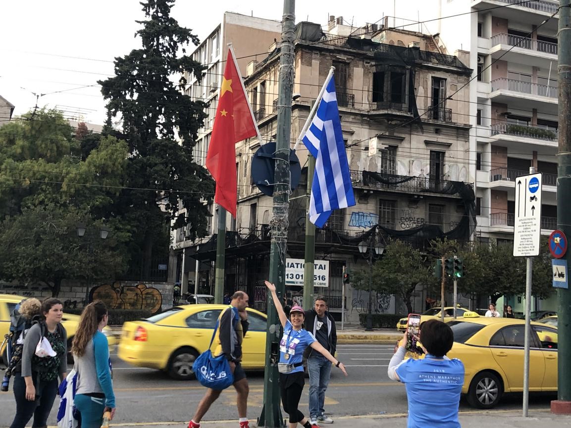 Chinese and Greek flags on the streets of Greece. (Photo by Hua Fang from People's Daily)