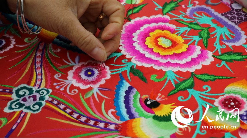 The embroideries on display at Shibadong show rich colors, with red and green being the main ones supplemented by other choices from the makers like blue or purple. (Photo: Yuan Meng/People's Daily Online)