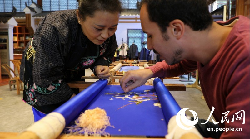 People's Daily Online's Jeffrey Moeller(R) learns the craftsmanship from Shi Meimei(L). (Photo: Yuan Meng/People's Daily Online)