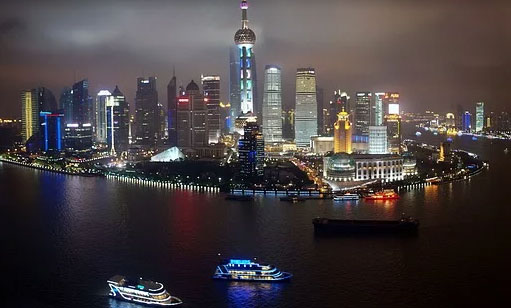 A night view of the Huangpu River and the Lujiazui Financial District in Pudong, Shanghai.
