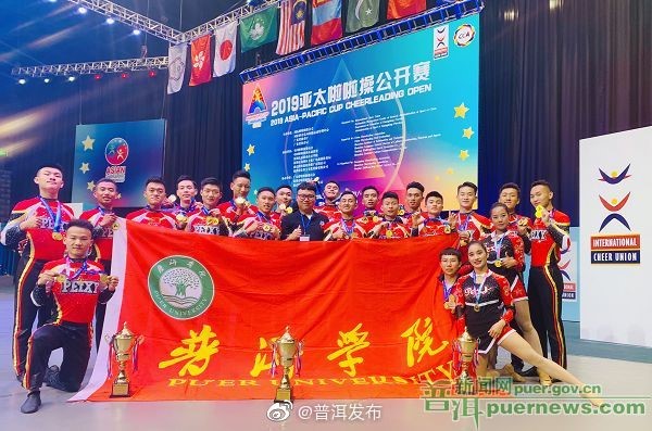 Recently, the 2019 Asian Cheerleading Championship and Asia Pacific cheerleading open tournament, jointly sponsored by International Cheer Union and State Physical Culture Administration, was held in Shenzhen. The cheerleading team of Pu'er University won two championships and one runner-up.