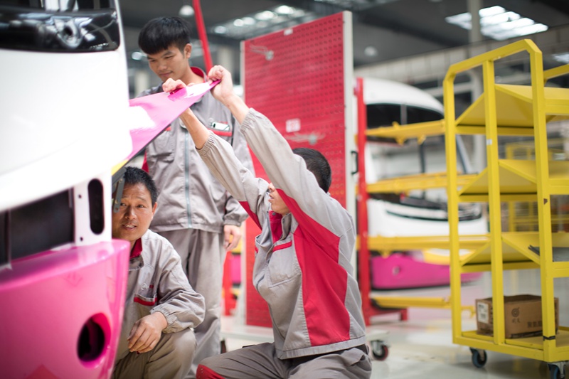 Workers assembly new energy buses at a factory of Guangxi Hope Automobile Co., Ltd. (Photo/Tanja Herko)