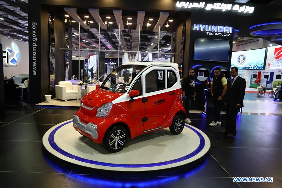 Photo taken on Dec. 1, 2019 shows the e-Motion vehicle in the booth of Egypt's Ministry of Military Production during the 23rd Information and Communications Technology Exhibition and Conference in Cairo, Egypt. Chinese corporations took part in a large information and communications technology exhibition starting from Sunday in Cairo with the participation of around 500 international and local companies. (Xinhua/Ahmed Gomaa)