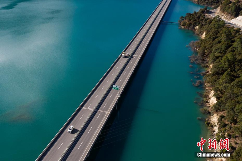 As the most beautiful highway in Tibet, the Dobutte bridge section of the Lalin freeway in Nyingchi city is also known as the "most beautiful water highway", which runs across the crystal blue waters of Tibet.(Photo/He Penglei)