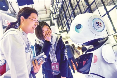 Visitors interact with a 5G-based robot at World 5G Convention held this November in Beijing, Nov.21, 2019. (Photo/ Xinhua)