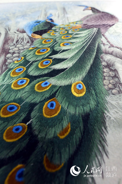 A lifelike peacock embroidered by Gu on Xuan paper. (Photo/Shi Yu)