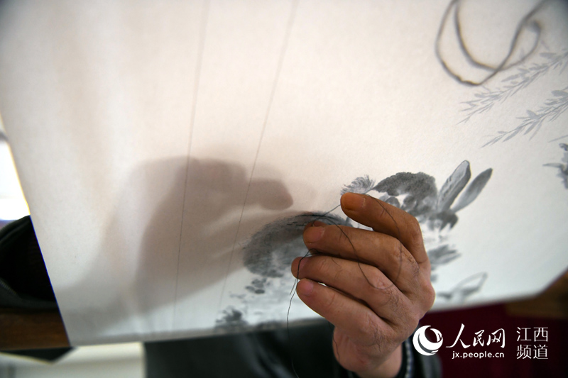 Gu uses the other hand to pull the needle on the back of the paper. (Photo/Shi Yu)