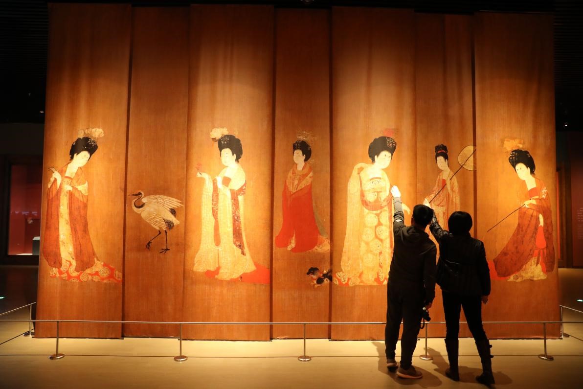Tourists appreciate the enlarged replica of the ancient Chinese painting Lady with Flowers. (People’s Daily Online/ He Zhuoyan)