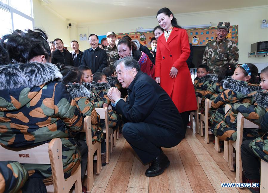 Wang Yang, a member of the Standing Committee of the Political Bureau of the Communist Party of China Central Committee and chairman of the National Committee of the Chinese People's Political Consultative Conference, talks with a child at Aimin Kindergarten in Liangshan Yi Autonomous Prefecture, southwest China's Sichuan Province, Dec. 12, 2019. China's top political advisor Wang Yang has stressed efforts to make sure no ethnic group is left behind in the course of building a moderately prosperous society in all respects. He was on an inspection tour in Liangshan Yi Autonomous Prefecture from Thursday to Saturday. (Xinhua/Rao Aimin)