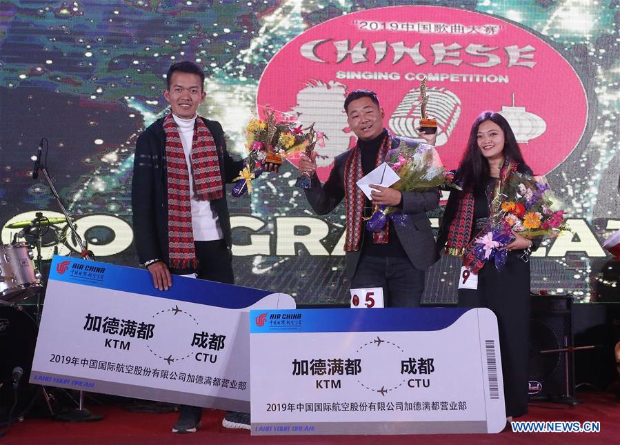 Winners cheer with their trophy and gifts after winning the final round of the Chinese Singing Competition 2019 in Kathmandu, Nepal, Dec. 16, 2019. More than 300 Nepalese youths participated in the event. (Photo by Sunil Sharma/Xinhua)