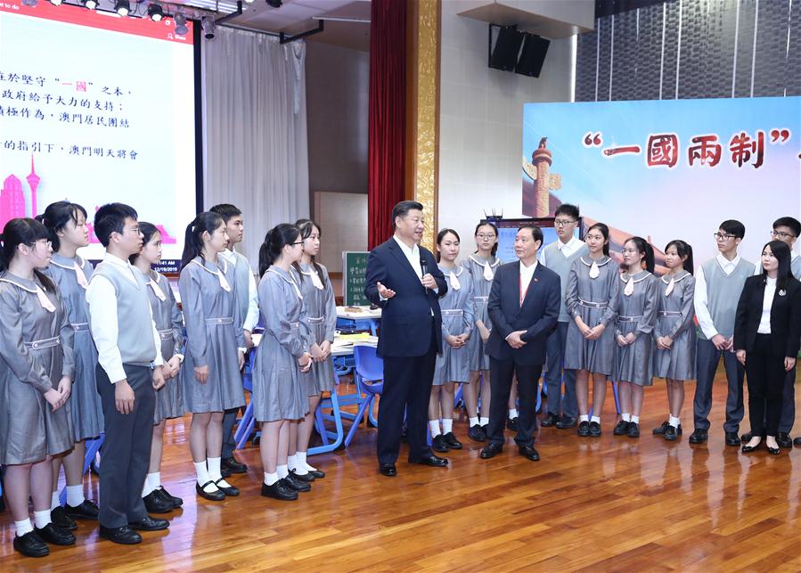 Chinese President Xi Jinping speaks after watching a Chinese history class themed "'one country, two systems' and Macao" at the Premier School Affiliated to Hou Kong Middle School, in south China's Macao, Dec. 19, 2019. (Xinhua/Ju Peng)