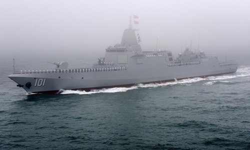 The guided-missile destroyer Nanchang of the Chinese People's Liberation Army (PLA) Navy takes part in a naval parade staged to mark the 70th founding anniversary of the PLA Navy on the sea off Qingdao, east China's Shandong Province, on April 23, 2019. (Photo: Xinhua)