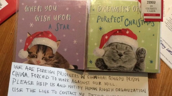The allegations came to light when The Sunday Times reported that six-year-old Florence Widdicombe from Tooting, south London, discovered a message inside of a box of charity Christmas cards bought from British grocery giant Tesco, reading “We are foreign prisoners in Shanghai Qingpu Prison China. Forced to work against our will. Please help us, notify human rights organization and contact Mr. Peter Humphrey.”