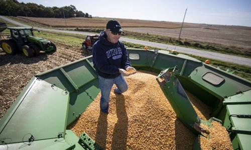 Farm owner Bill Pellett examines havested corn on a combine harvester in a field of his family farm in Atlantic, a small city in the Midwestern state of Iowa, the United States, Oct. 14, 2019. (Xinhua/Wang Ying)