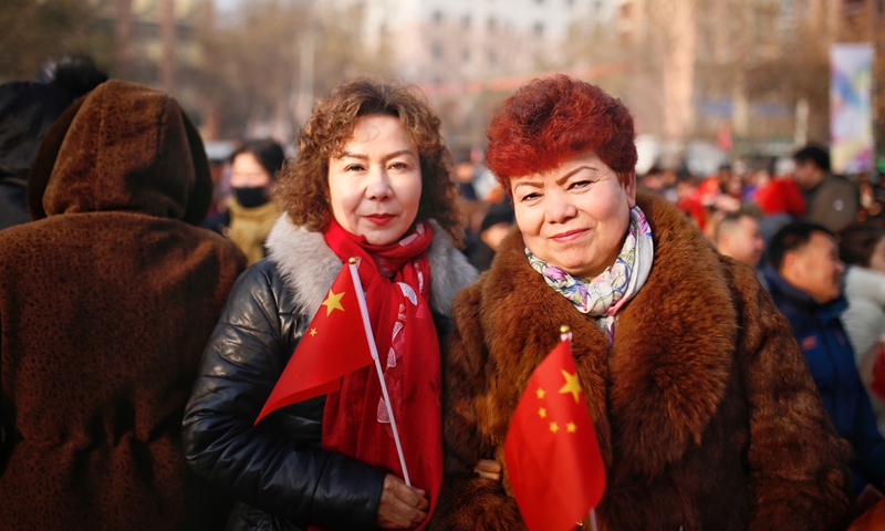 Uyghur women wave the Chinese national flag in Baicheng county of Xinjiang. Photo: Shan Jie/GT