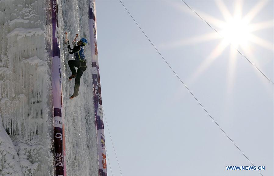 Liam Foster of the United States competes during the men's speed final at 2019-2020 UIAA (International Climbing and Mountaineering Federation) Ice Climbing World Cup at Lotus Mountain in Changchun, capital of northeast China's Jilin Province, Jan. 5, 2020. (Xinhua/Luo Yuan)