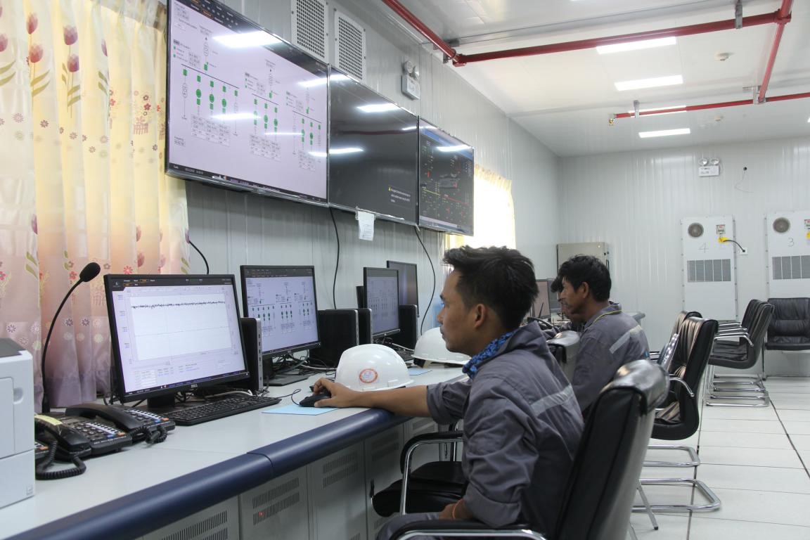 Technicians of Myanmar work in the master-control room of the gas-fired power plant in Belin, Kyuakse Township in Mandalay, Myanmar. (Photo by Sun Guangyong from People’s Daily)