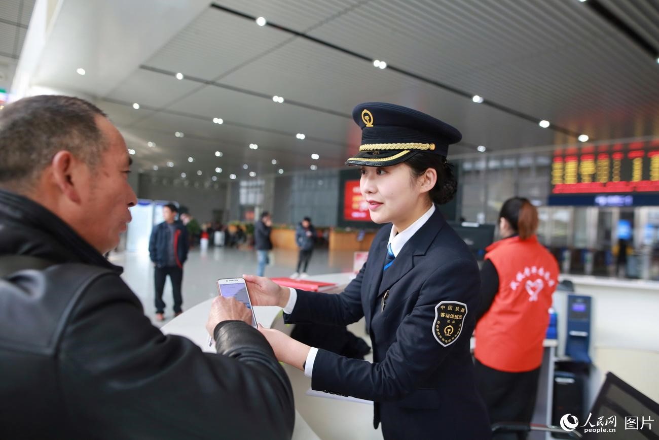 Liu Peihan answers a traveler’s questions at the service center. (Photo/People's Daily Online)