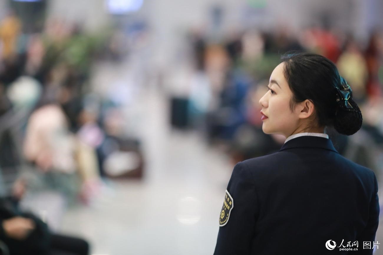 Liu patrols the waiting room at the Fulingbei railway station. (Photo/People's Daily Online)
