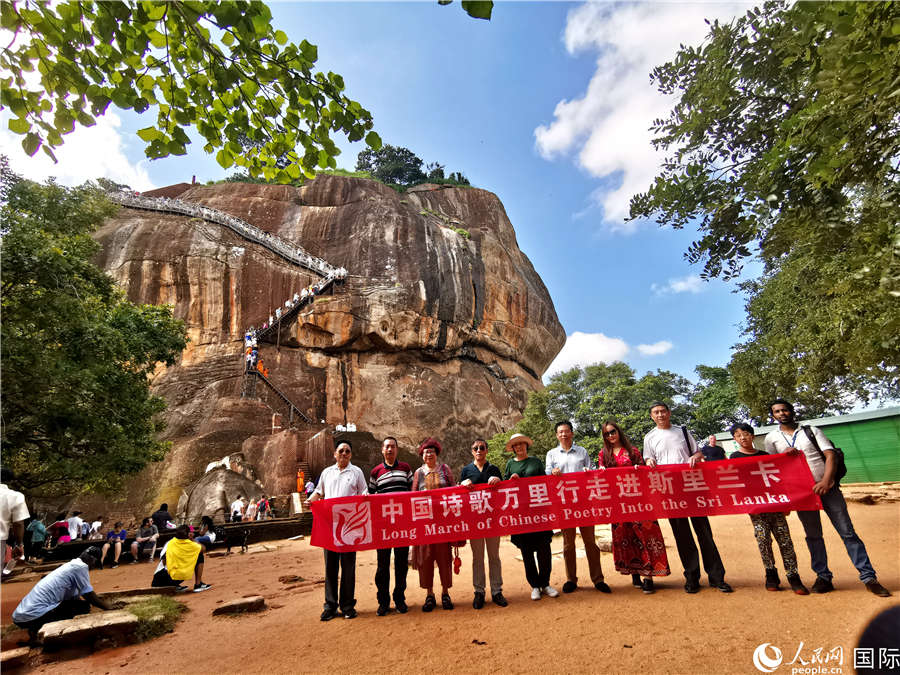 Chinese poets pose for a photo at the Lion Rock in Sri Lanka. (Photo/People's Daily Online)