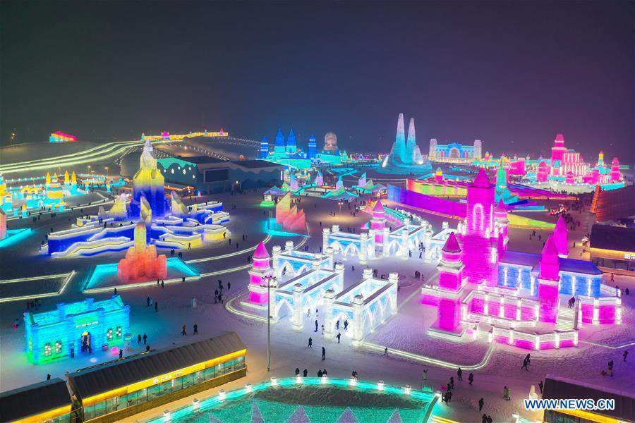 Aerial photo taken on Jan. 7, 2020 shows a night view of the 21st Harbin Ice-Snow World in Harbin, capital of northeast China's Heilongjiang Province. (Xinhua/Xie Jianfei)