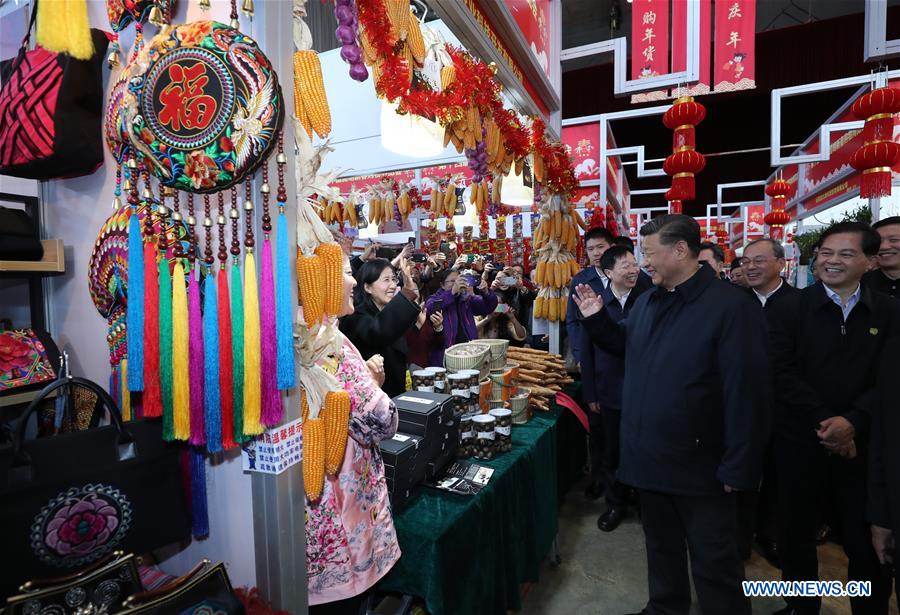 Chinese President Xi Jinping, also general secretary of the Communist Party of China Central Committee and chairman of the Central Military Commission, inspects market supply for Chinese New Year at the Kunming International Convention and Exhibition Center in Kunming, southwest China's Yunnan Province, Jan. 20, 2020. Xi has extended Chinese New Year greetings to all Chinese people during a three-day inspection tour to Yunnan Province which concluded Tuesday. (Xinhua/Ju Peng)