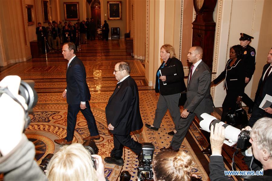 U.S. House Intelligence Committee Chairman Adam Schiff (1st L), U.S. House Judiciary Committee Chairman Jerry Nadler (2nd L) and other impeachment managers arrive at the Senate Chamber before the start of the Senate impeachment trial on Capitol Hill in Washington D.C., the United States, on Jan. 21, 2020. The impeachment trial against U.S. President Donald Trump kicked off Tuesday in the Senate as the chamber debated, and would later vote on, a resolution stipulating rules guiding the process. (Photo by Ting Shen/Xinhua)
