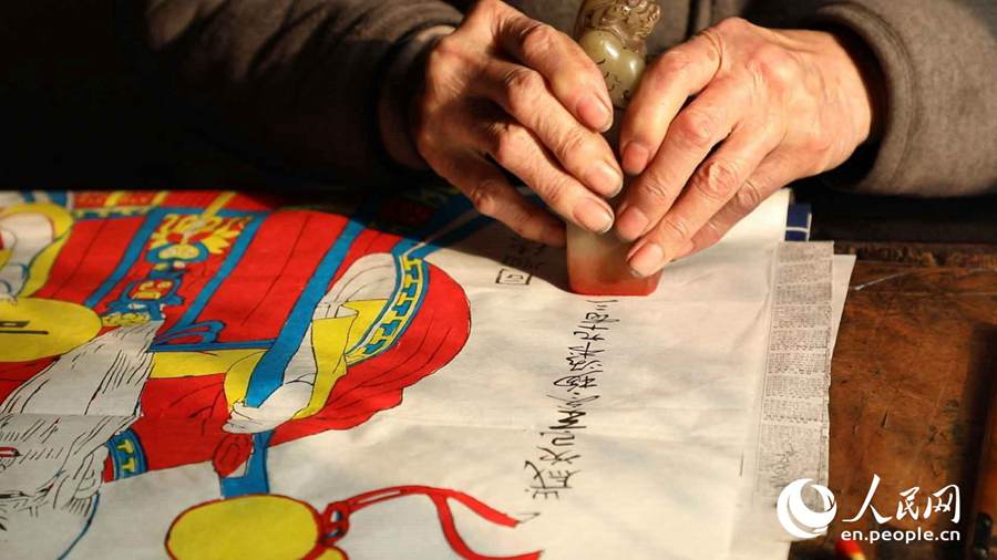 Yang Luoshu stamps the New Year's paintings he created in his workshop in Yangjiabu Village of Hanting District in Weifang, east China's Shandong Province, Jan. 20, 2020. (Photo/Liu Jing)