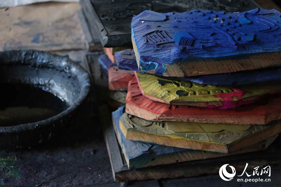 Woodblocks used to print the beautiful New Year paintings in Yang Luoshu's workshop in Yangjiabu Village of Hanting District in Weifang, east China's Shandong Province, Jan. 20, 2020. (Photo/Liu Jing)