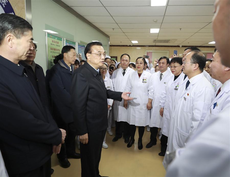 Chinese Premier Li Keqiang, also a member of the Standing Committee of the Political Bureau of the Communist Party of China (CPC) Central Committee, talks with medical workers at the Qinghai Red Cross Hospital in Xining, capital of northwest China's Qinghai Province, Jan. 21, 2020. Li made an inspection tour in northwest China's Qinghai Province from Tuesday to Wednesday. (Xinhua/Ding Lin)