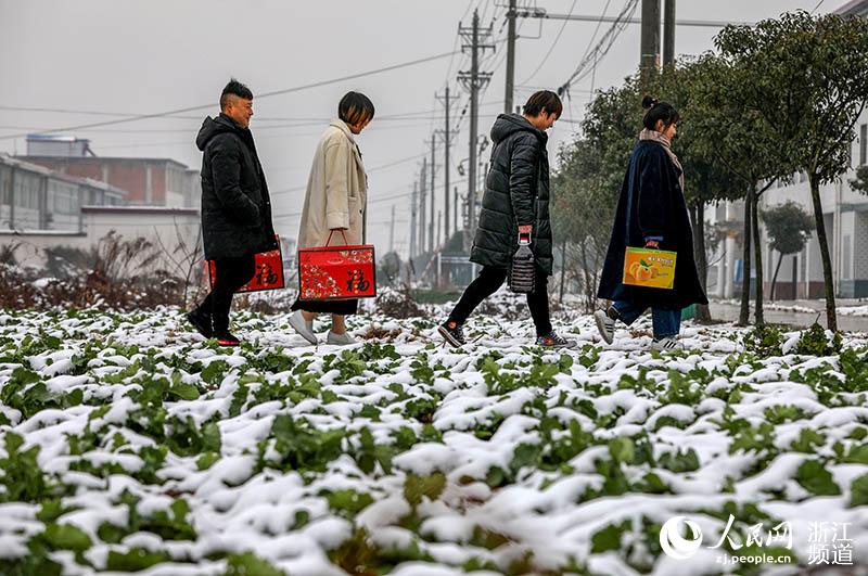 Liu and her daughter and son arrive home, where her husband Li Hongyu (first from left) greets them, Jan.16. (Photo/Zhang Yongtao)