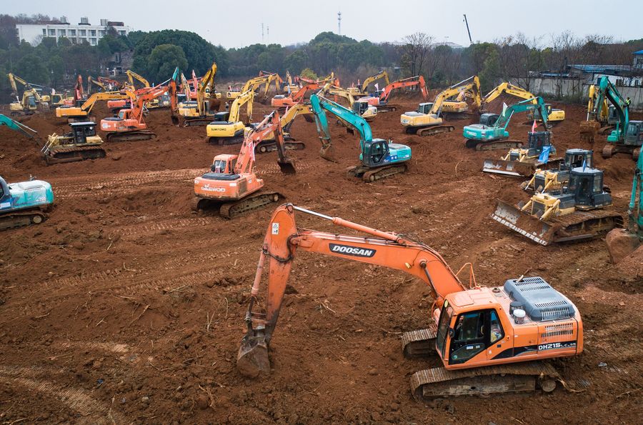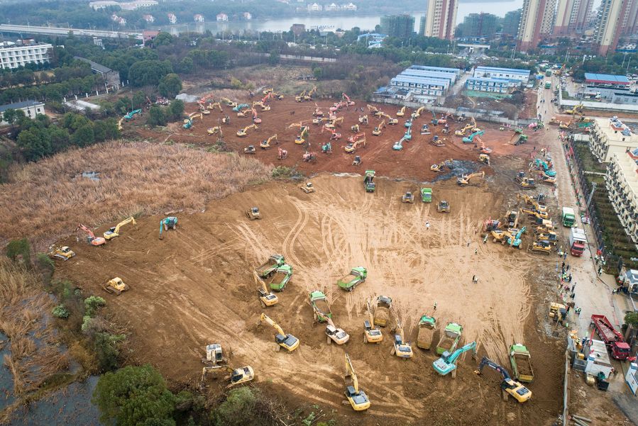 Aerial photo shows mechanical equipment working at the construction site in the Caidian District of western suburb of Wuhan, Jan. 24, 2020. (Xinhua/Xiao Yijiu)
