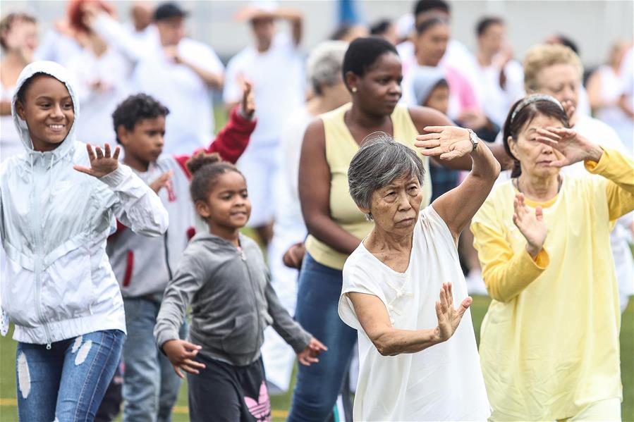 People attend a Tai Chi Chuan practice during a Chinese Lunar New Year celebration in Sao Paulo, Brazil, on Jan. 25, 2020. (Str/Xinhua)