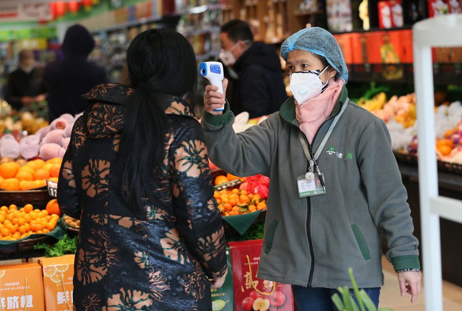 A staff member takes temperature of a customer at the entrance of a supermarket in Hankou, central China’s Hubei province, Jan. 31, 2020, the 7th day of the Lunar New Year. (Photo by Zhou Guoqiang/People’s Daily)