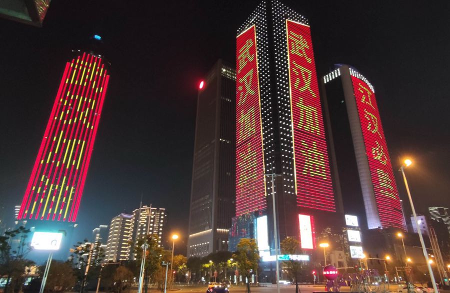 Photo taken on Jan. 31, 2020 shows buildings in Wuhan illuminated with slogans to boost confidence for the city amid the fight against the novel coronavirus. (Photo by Li Changlin/People’s Daily)
