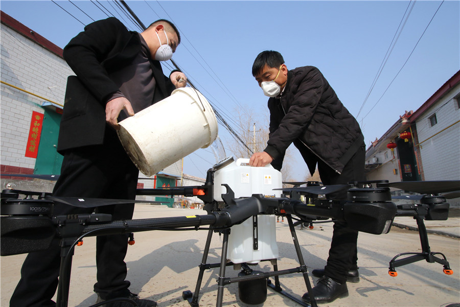 Workers pour disinfectant into a drone's tank in Zhengwan village, Handan, Hebei province, on Jan 31. The drone is used to spray disinfectant on roads in the village. [Photo by Hu Gaolei/For China Daily]