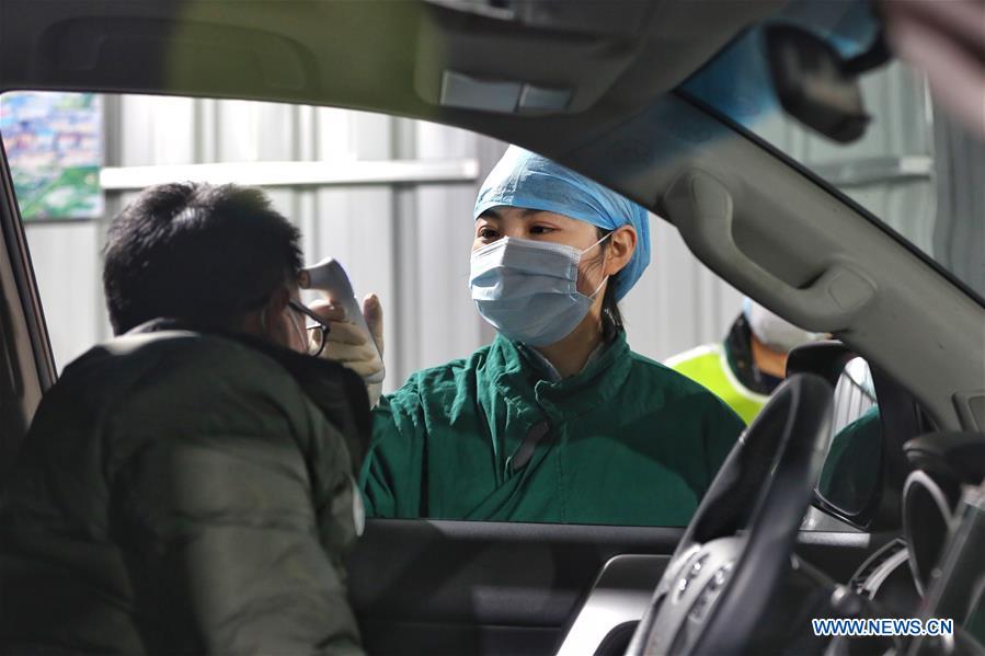 Fang Mengxia checks a driver's temperature at the epidemic check point of Jintang high-speed channel in Zhoushan, east China's Zhejiang Province, Feb. 10, 2020. Yang Chenhua, a police officer with Dinghai branch police station of Zhoushan police office, has been working and living at the epidemic check point since the outbreak of the novel coronavirus. His wife Fang Mengxia, a medical staff member, except for her routine work at hospital, has one chance per week to come to the check point to measure the temperature for people passing by. And this once a week meeting after works at the check point is their only chance to talk face to face for the moment. (Photo by Zou Xunyong/Xinhua)