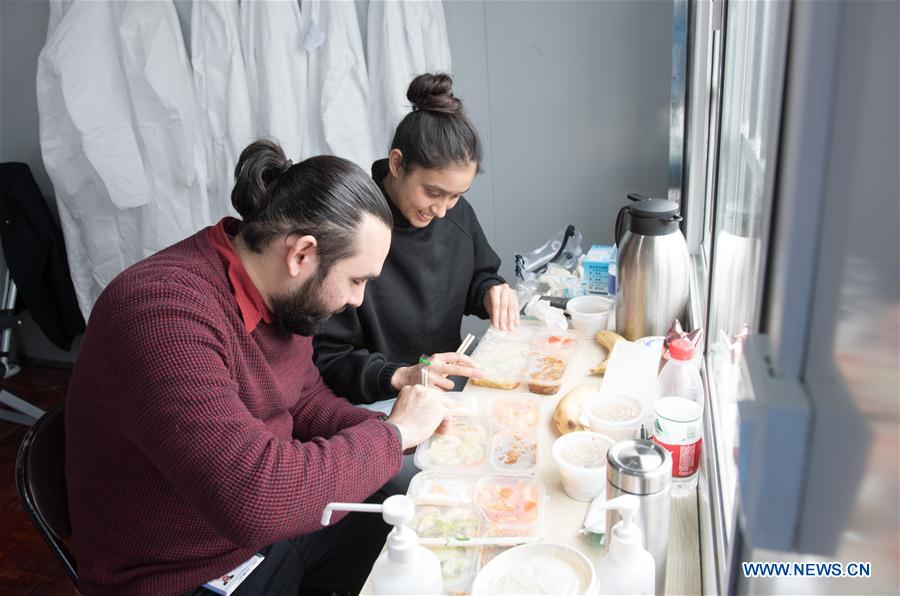Pakistani Abdul Zahir Hamad (L) and his wife Mauritian Hosany Sumayyah have lunch at a novel coronavirus prevention-and-control checkpoint of an expressway exit in Wenzhou, east China's Zhejiang Province, Feb. 8, 2020. Pakistani Abdul Zahir Hamad and Mauritian Hosany Sumayyah, a married couple, both work as doctors at Panhealth Medical Center in Wenzhou. Since the outbreak of the novel coronavirus, they have been serving as volunteers at a highway exit checkpoint in Wenzhou, checking identity information and measuring body temperature for drivers and passengers. "We must do something," said the couple, who received higher education and fell in love with each other in China. "China is our second hometown. We hope the epidemic ends soon and people can get back to their normal life." (Xinhua/Weng Xinyang)