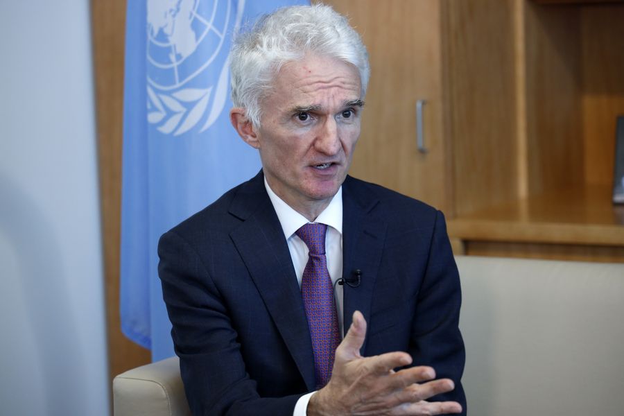 United Nations Undersecretary-General for Humanitarian Affairs and Emergency Relief Coordinator Mark Lowcock speaks in an interview with Xinhua at the UN headquarters in New York, Feb. 13, 2020. (Xinhua/Li Muzi)