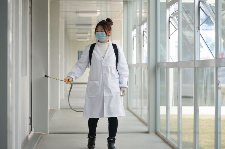 A staff member disinfects the administrative area of the construction site of China Eastern Airlines' production auxiliary area (phase one) in Chengdu Tianfu International Airport in Chengdu, southwest China's Sichuan Province, Feb. 11, 2020. (Photo by Xu Bingjie/Xinhua)
