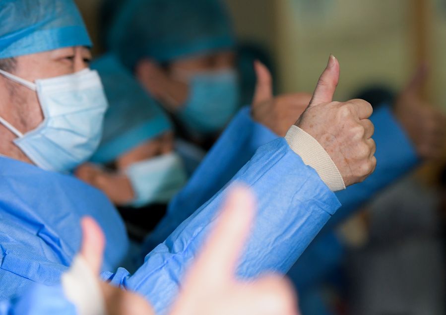 Cured novel coronavirus pneumonia patients cheer for themselves in a hospital in Wuhan, central China's Hubei Province, Feb. 6, 2020. A total of 23 novel coronavirus pneumonia patients were cured and discharged from hospital after integrated treatment with traditional Chinese medicine (TCM) and Western medicine. (Xinhua/Li He)