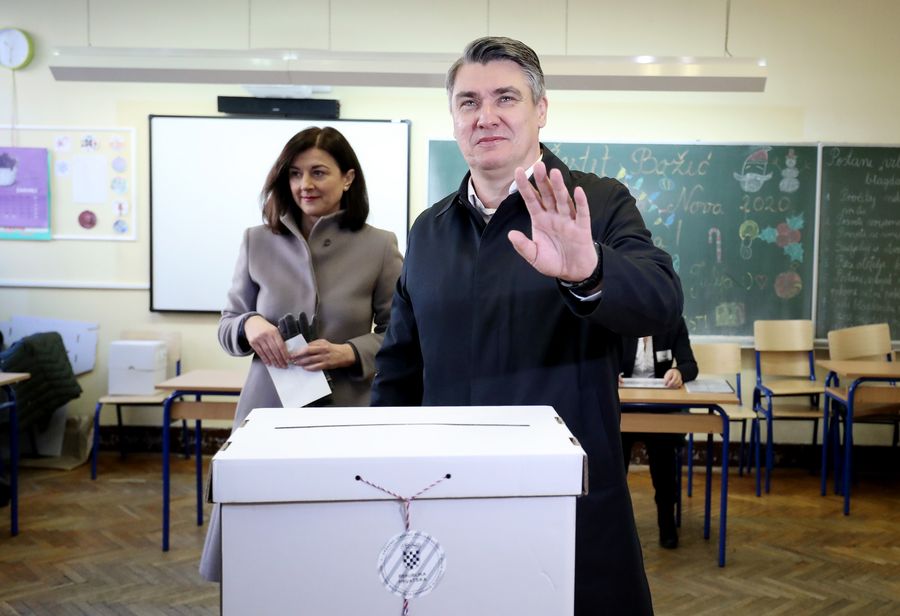 File photo shows Croatian presidential candidate and former Prime Minister Zoran Milanovic, accompanied by his wife Sanja Music Milanovic, casts his ballot at a polling station during the second round of the presidential election in Zagreb, capital of Croatia, Jan. 5, 2020. (Sanjin Strukic/Pixsell via Xinhua)