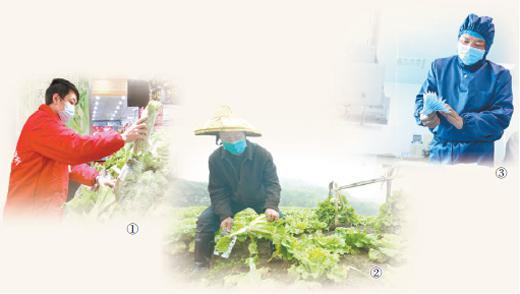 (1)He Chang puts vegetables on the shelf. (2) A local farmer harvests vegetables in Quzhou. (3) Fu Zhiyuan checks masks in his factory. (Photo/People's Daily)