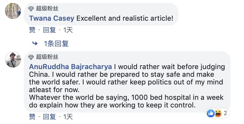 Positive comments also filled People’s Daily’s Facebook page. Facebook user AnuRuddha Bajracharya praised China for building a “1,000-bed hospital in a week” which “explains how China is working to keep it [under] control”, while another user immediately strengthened the evidence by posting a link showing that for this year’s flu season in the US, “26 million people have been infected. Out of those, 14,000 people have died from the illness”, according to the Center for Disease Control and Prevention (CDC).