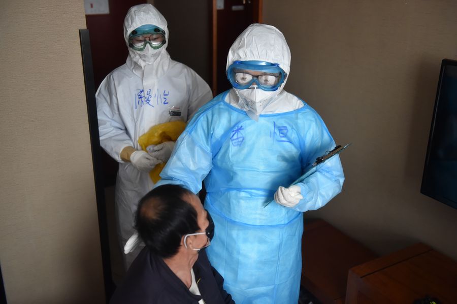 Medical workers check a worker of Leishenshan Hospital, a makeshift hospital built in Wuhan, at a medical observation area in Fengtai District of Beijing, capital of China, Feb. 21, 2020. (Photo by Chen Zhonghao/Xinhua)