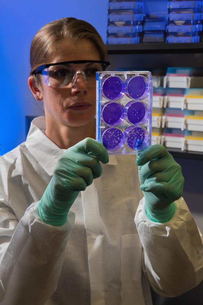 File photo: a scientist of the Centers for Disease Control and Prevention (CDC) examines the result of a plaque assay, which is a test that allows scientist to count how many flu virus particles are in a mixture. (Photo credit: CDC)