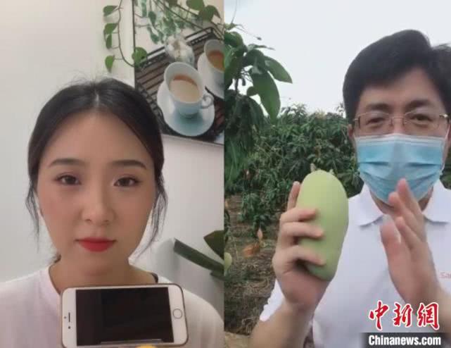 A Dong (right), mayor of Sanya, sells local mangoes in a live broadcast. (Photo/Chinanews.com)